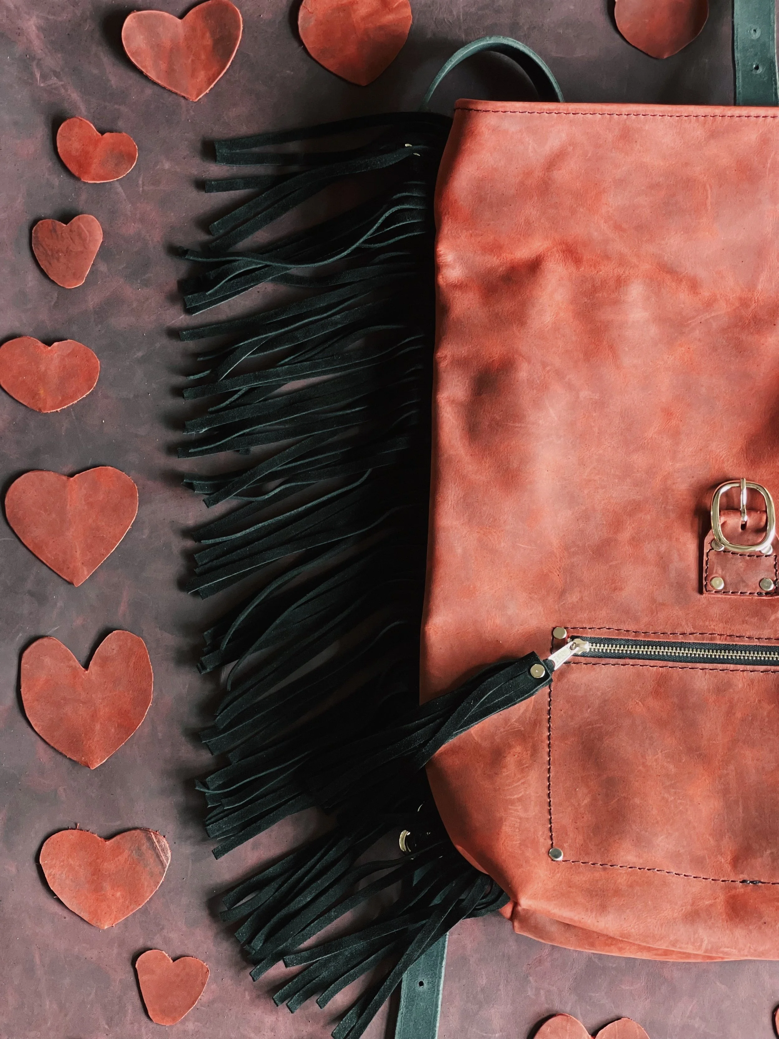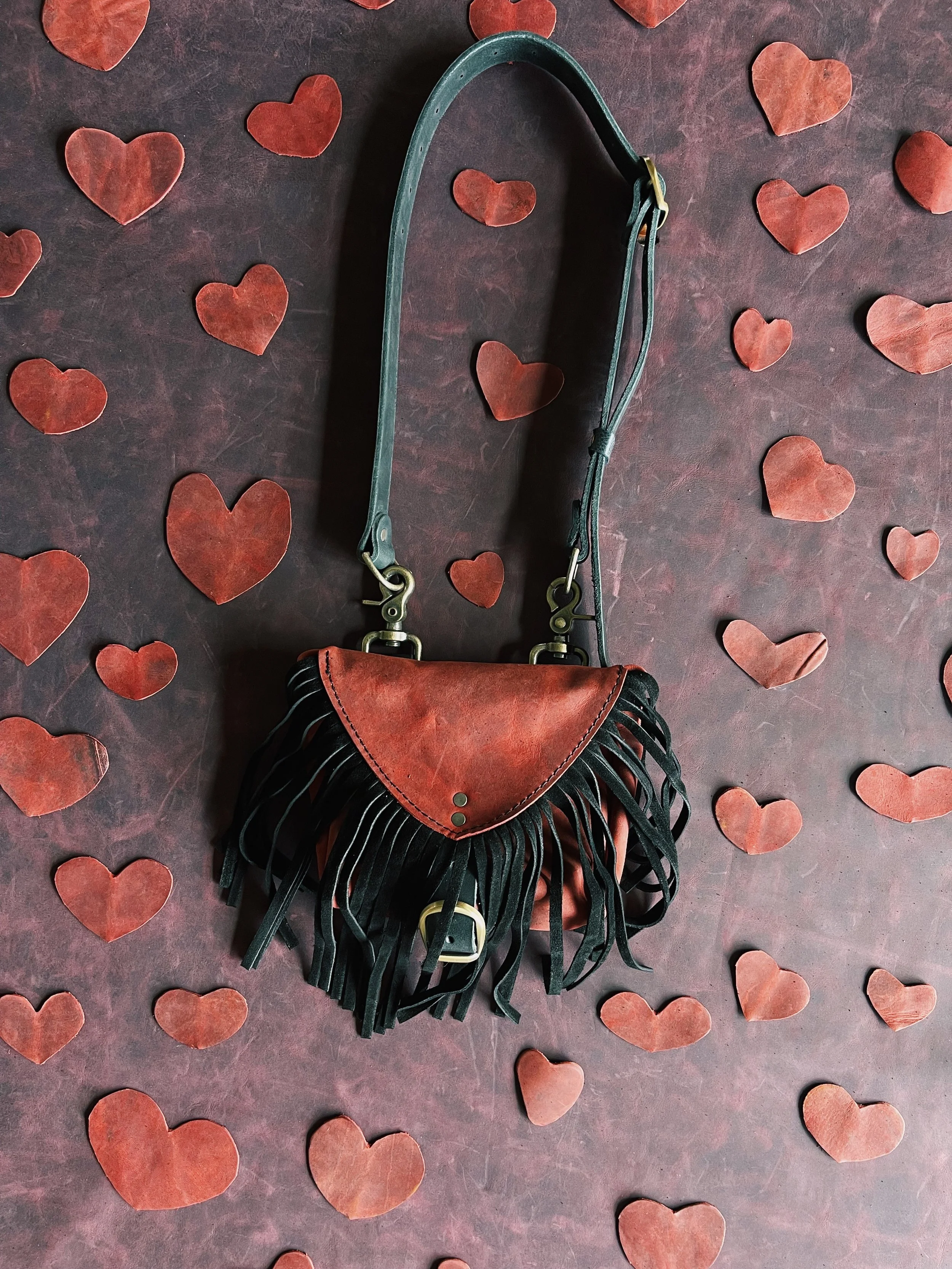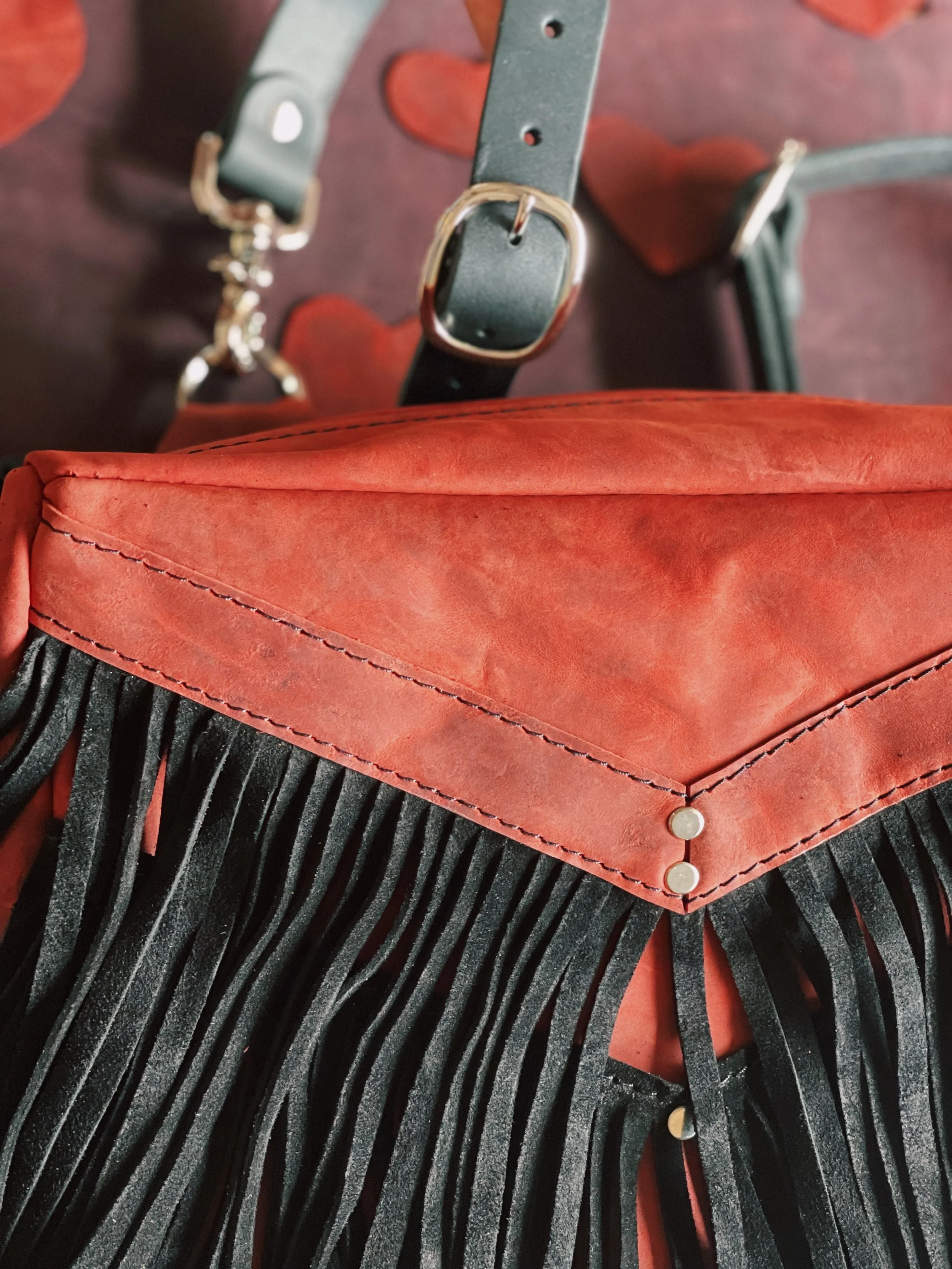 The red Crazy Horse cowhide leather I chose to use is a fantastic sturdy but soft material that is coated with wax. The wax gives it a unique surface and helps resist water. I love the surface and quality feel of this leather… and of course, the smell! I paired it a heavy black suede fringe. They’re perfect for one another. I picked some of our top selling styles to bring you this new mini Ready To Ship collection.