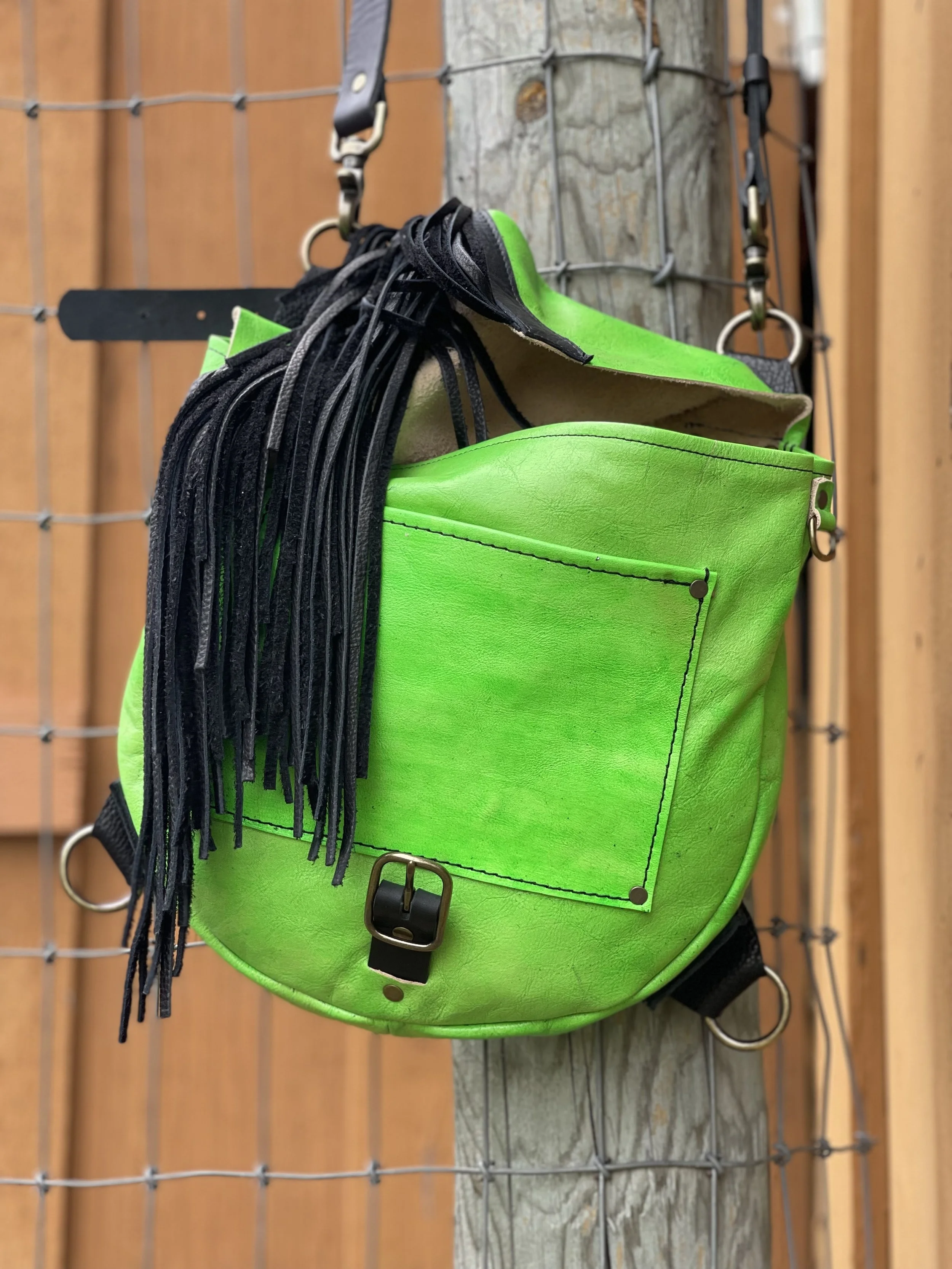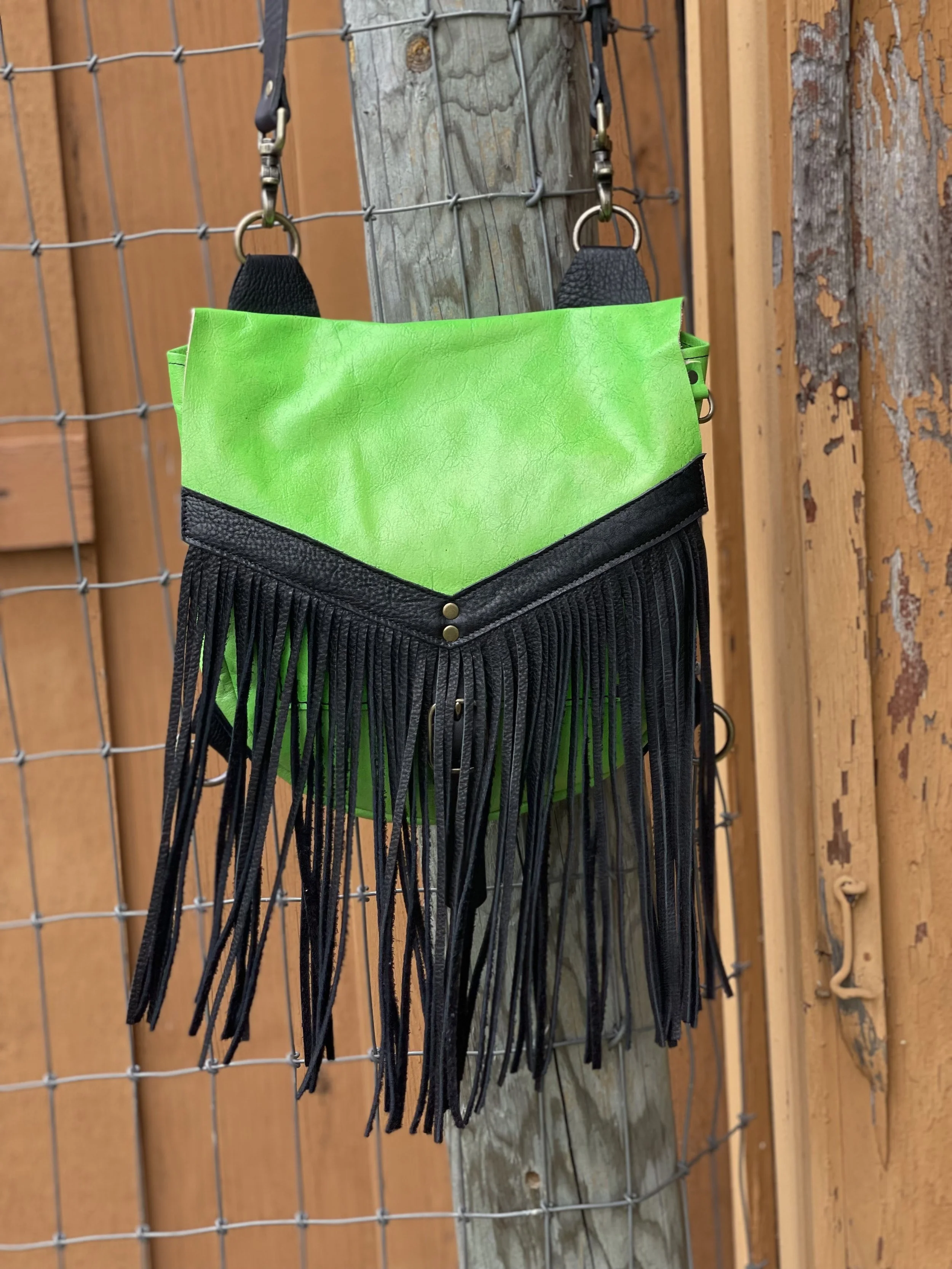 Sarah J Convertible Bag in hand dyed vegetable tanned leather in Neon Green, black bison leather fringe trim and fringe, and antique brass hardware.