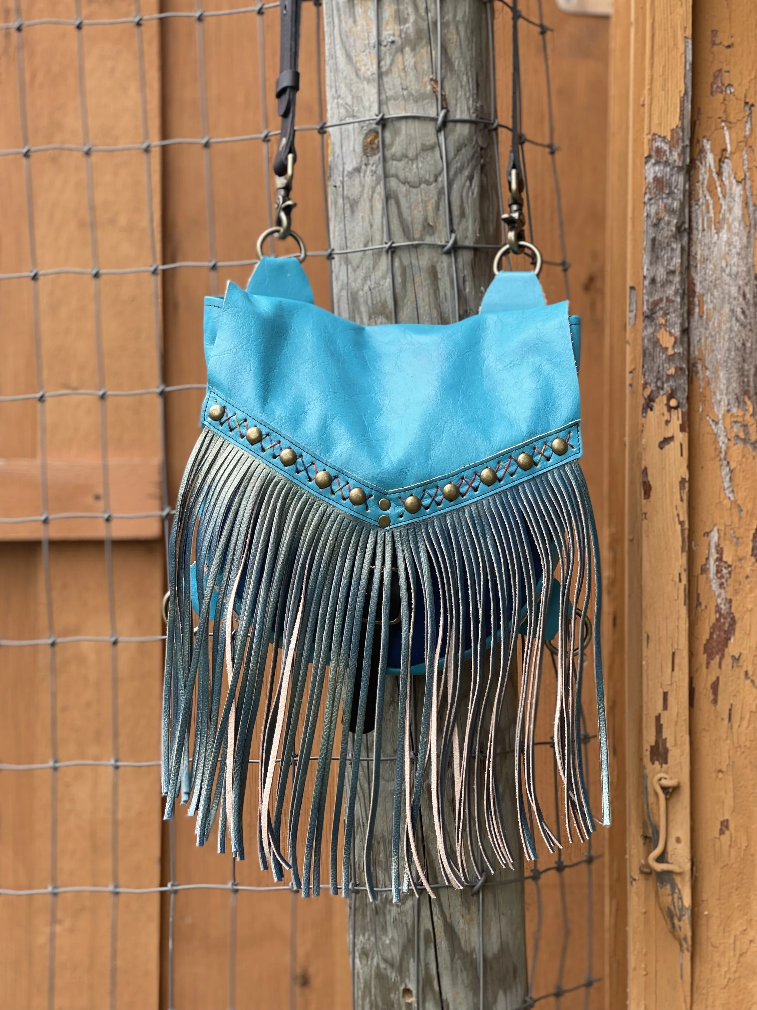 Sarah J Convertible Bag in ombre hand dyed vegetable tanned leather in Aqua to Deep Blue, hand dyed Aqua fringe trim, hand dyed vegetable tanned leather fringe in Blue Gold, Rainbow criss cross hand-stitching, studs, and a Flair D Ring.
