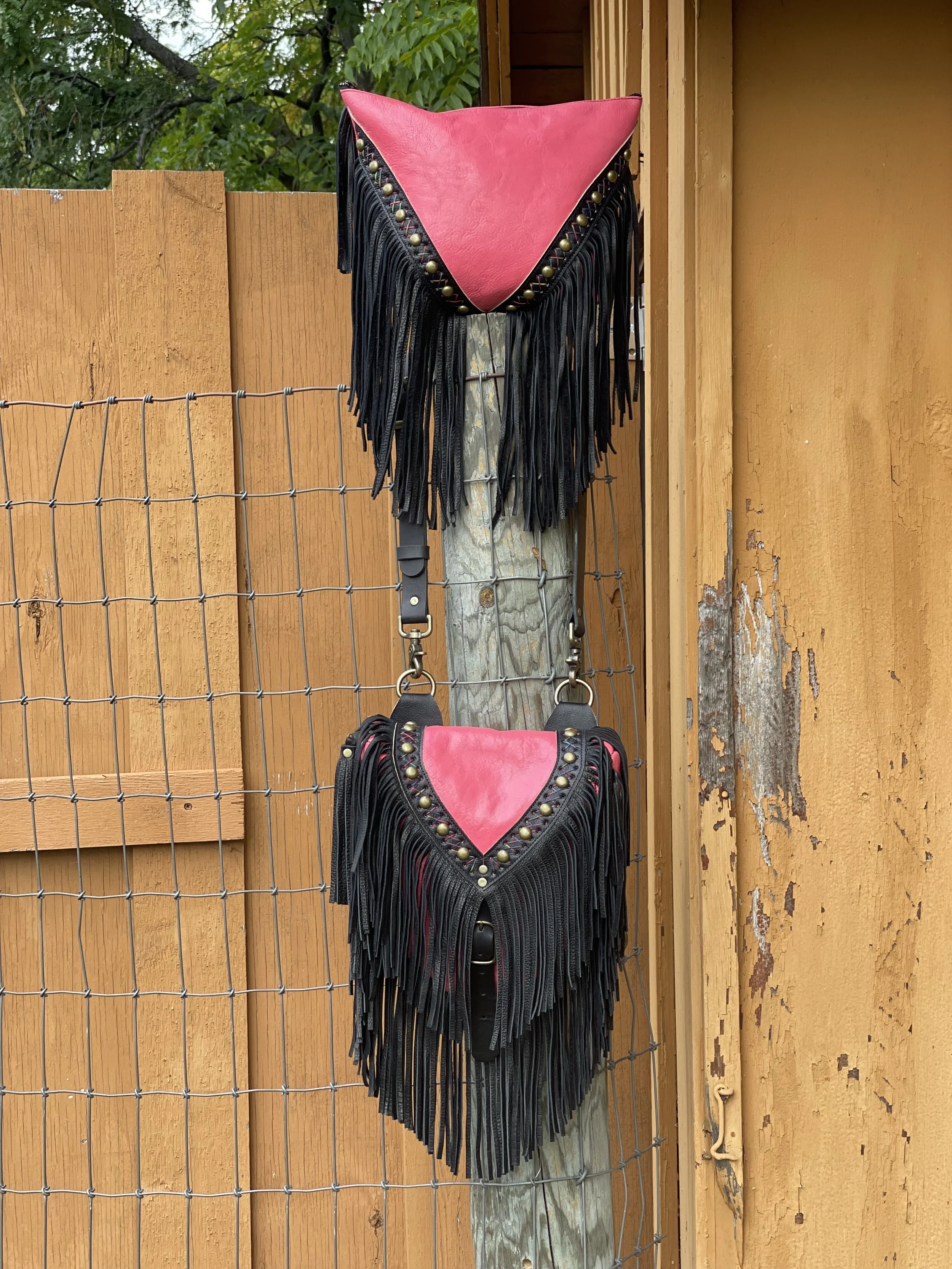 XL Radley Convertible Bag in hand dyed vegetable tanned cowhide leather in Bubblegum pink + Coal fringe trim, black bison leather fringe, antique brass hardware and studs, and Rainbow criss cross hand-stitching.