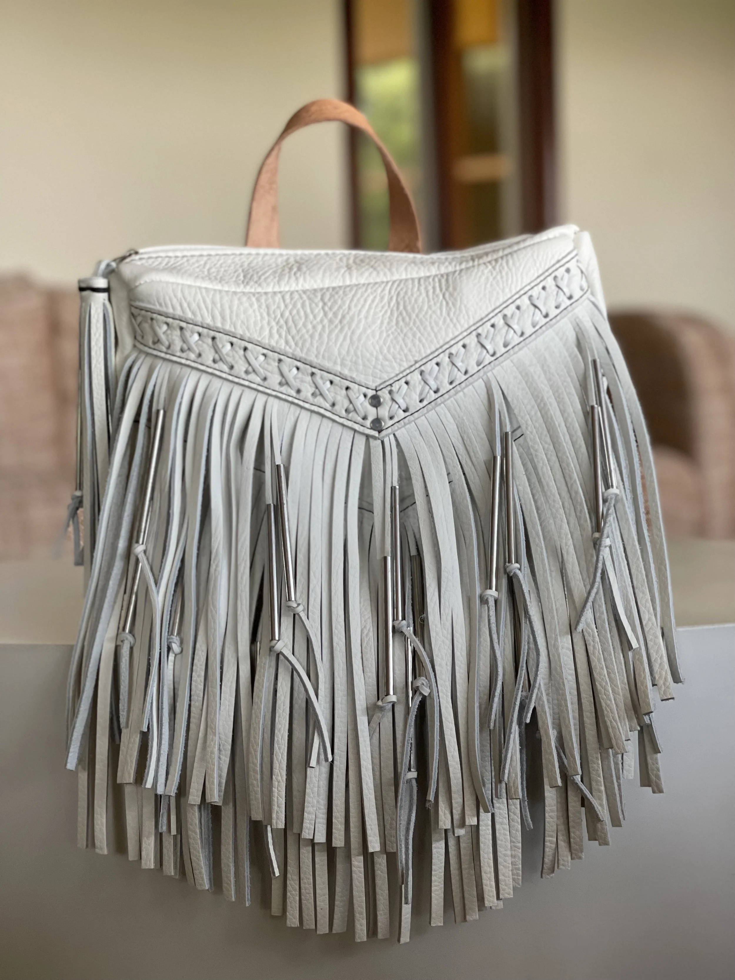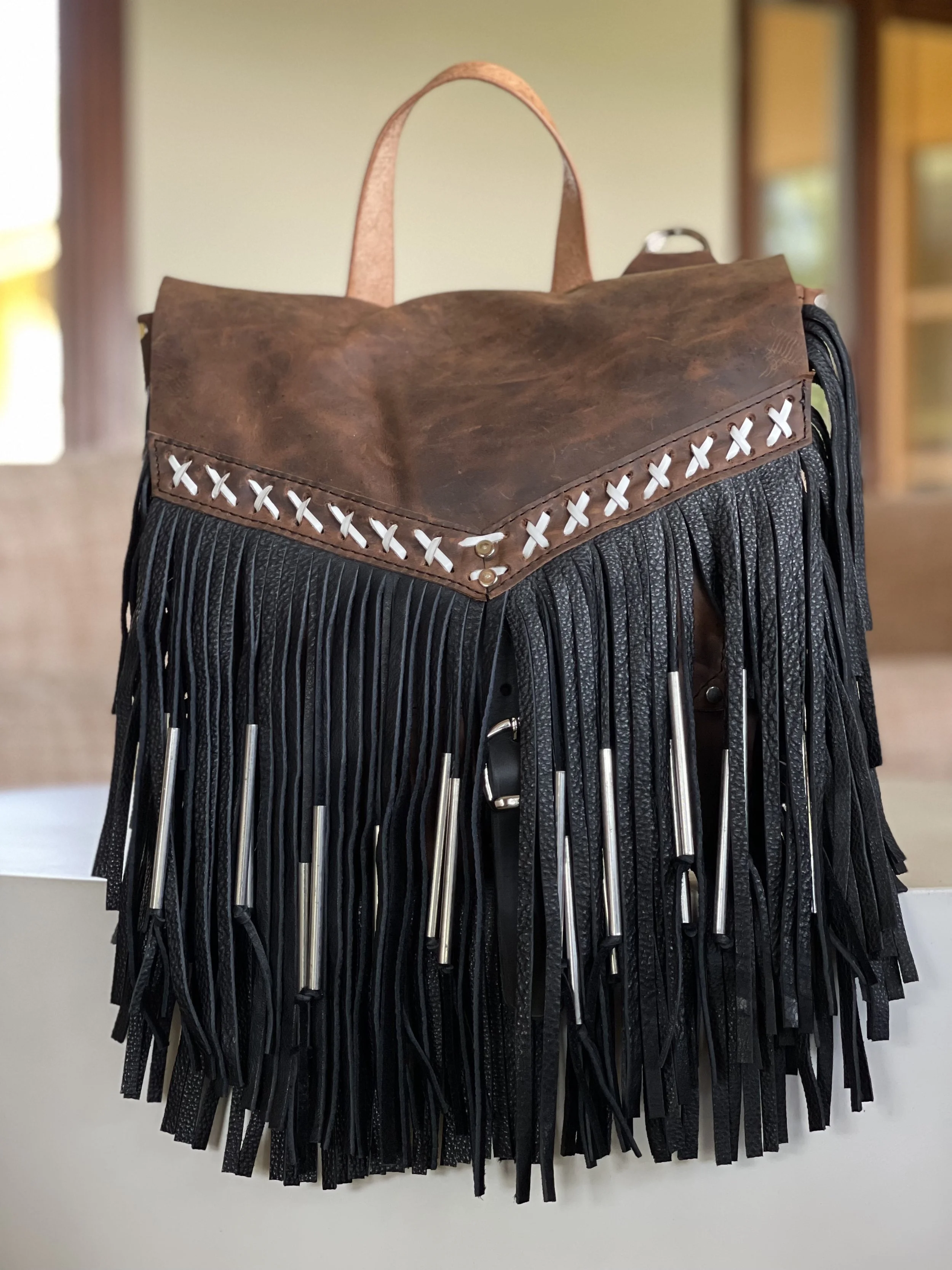 It’s just so wild to see so much American Bison and Elk because it’s their hides that I frequently use in my work. I felt more and more apart of my craft that I ever have. So for this collection, I had to experiment with NICKEL BEAD CAPS on the fringe, a leather lace for the criss-cross details, and extra extra fringe.