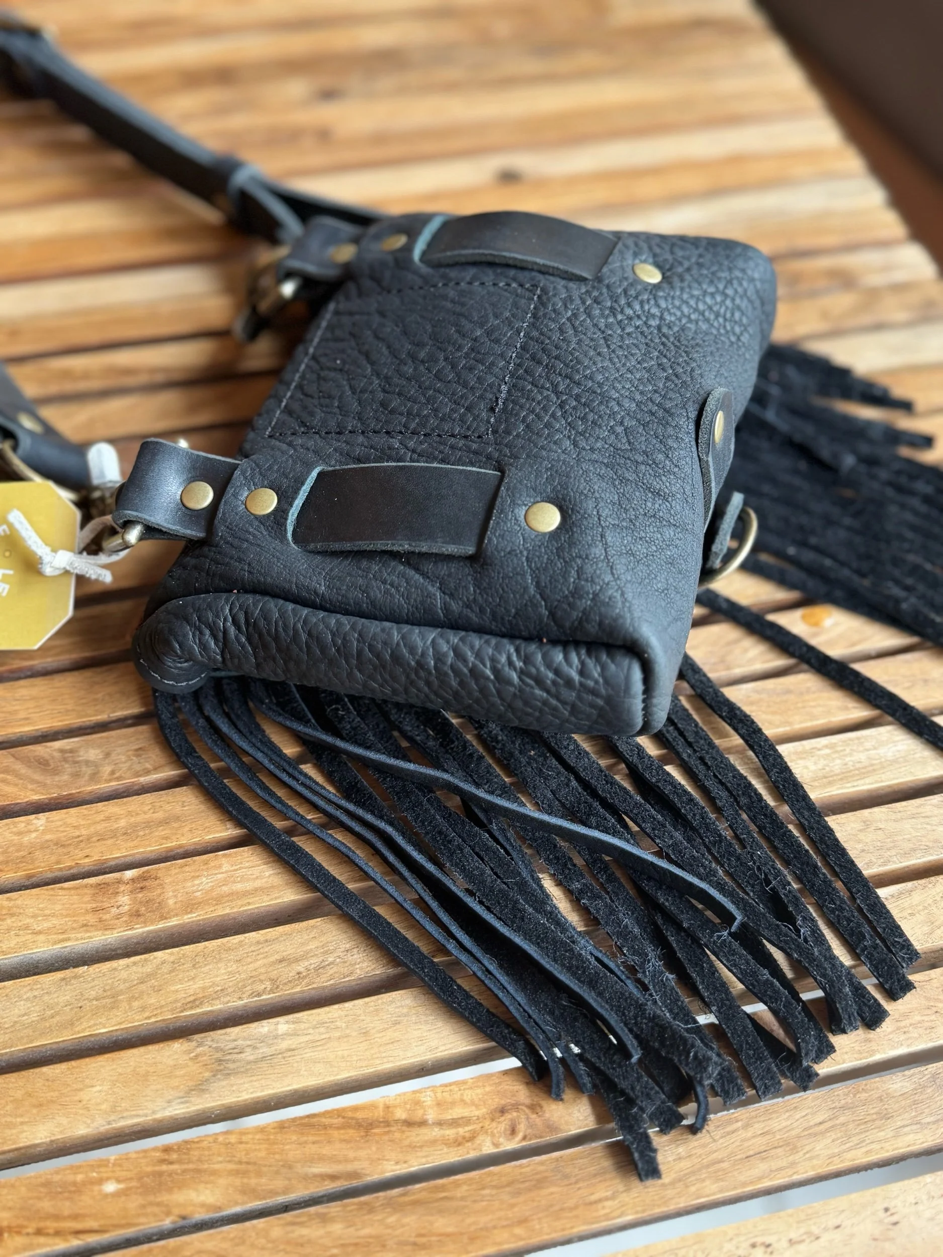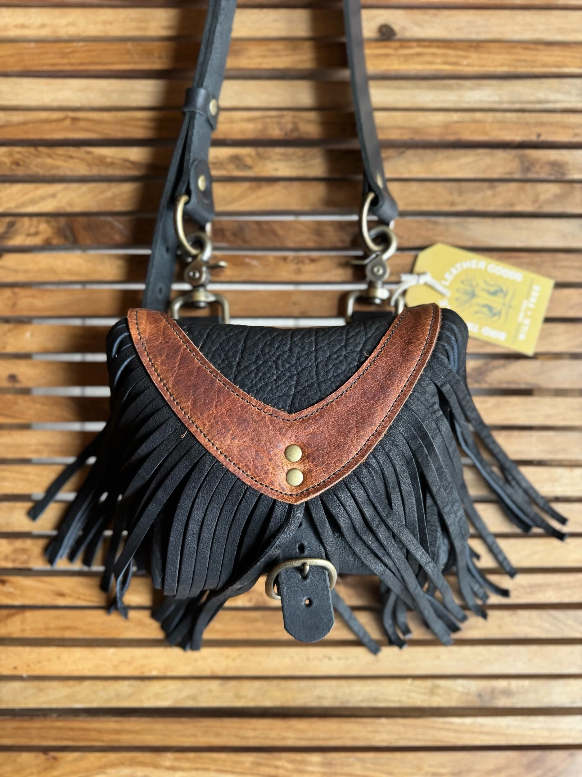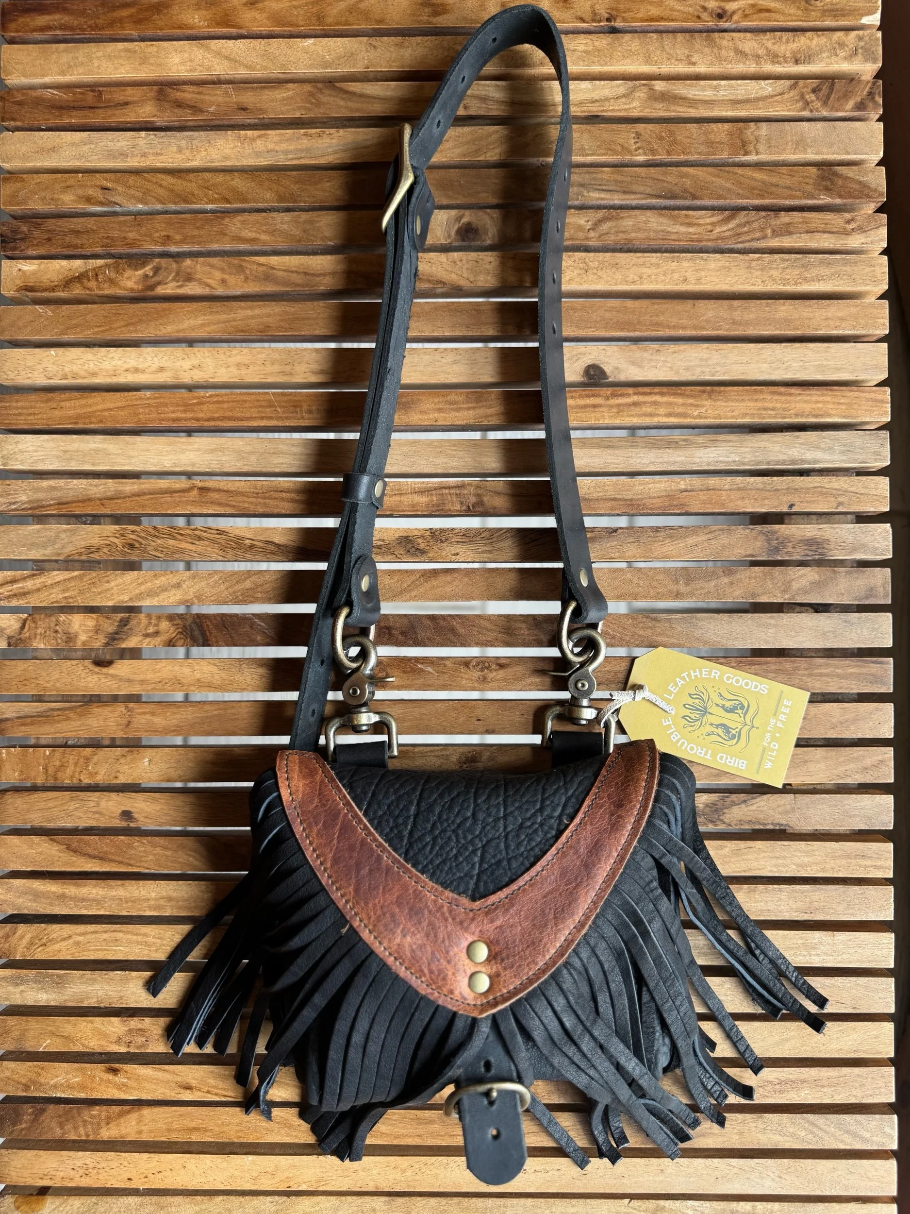 Materials: black 5/6oz bison leather, whiskey 5/6oz bison leather, antique brass or nickel zinc alloy and steel hardware.