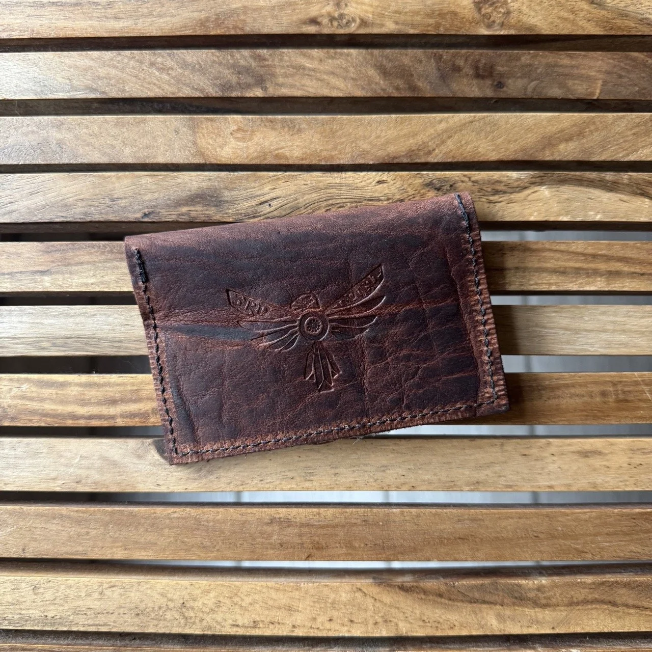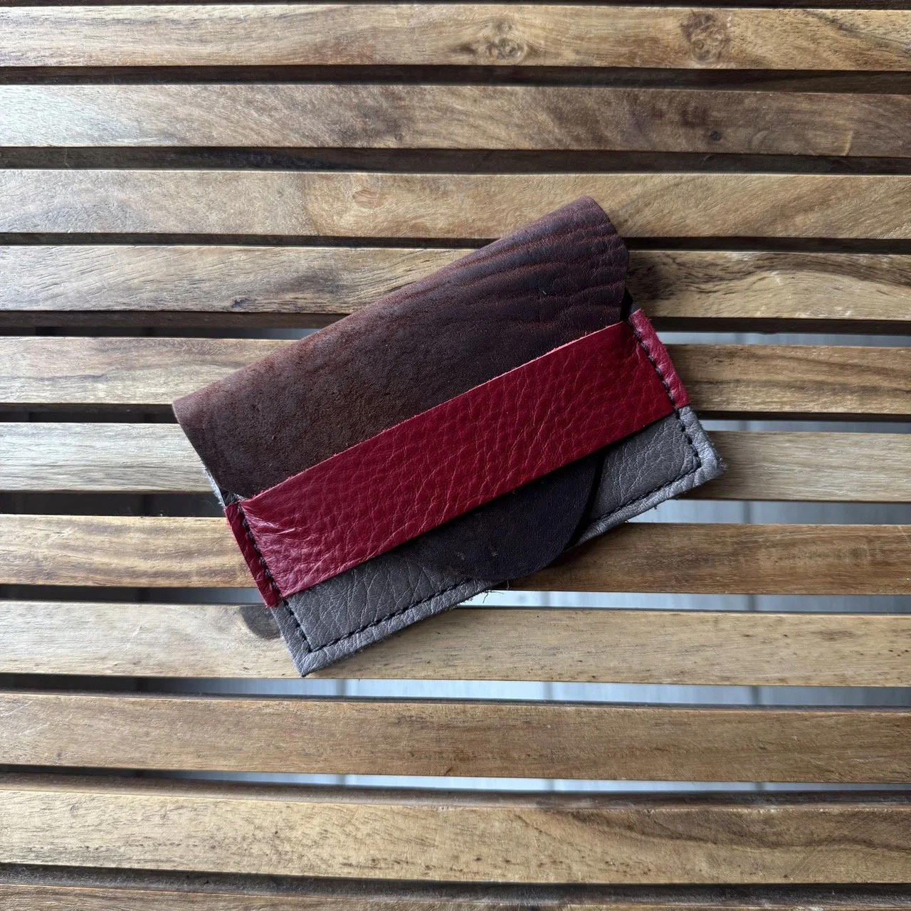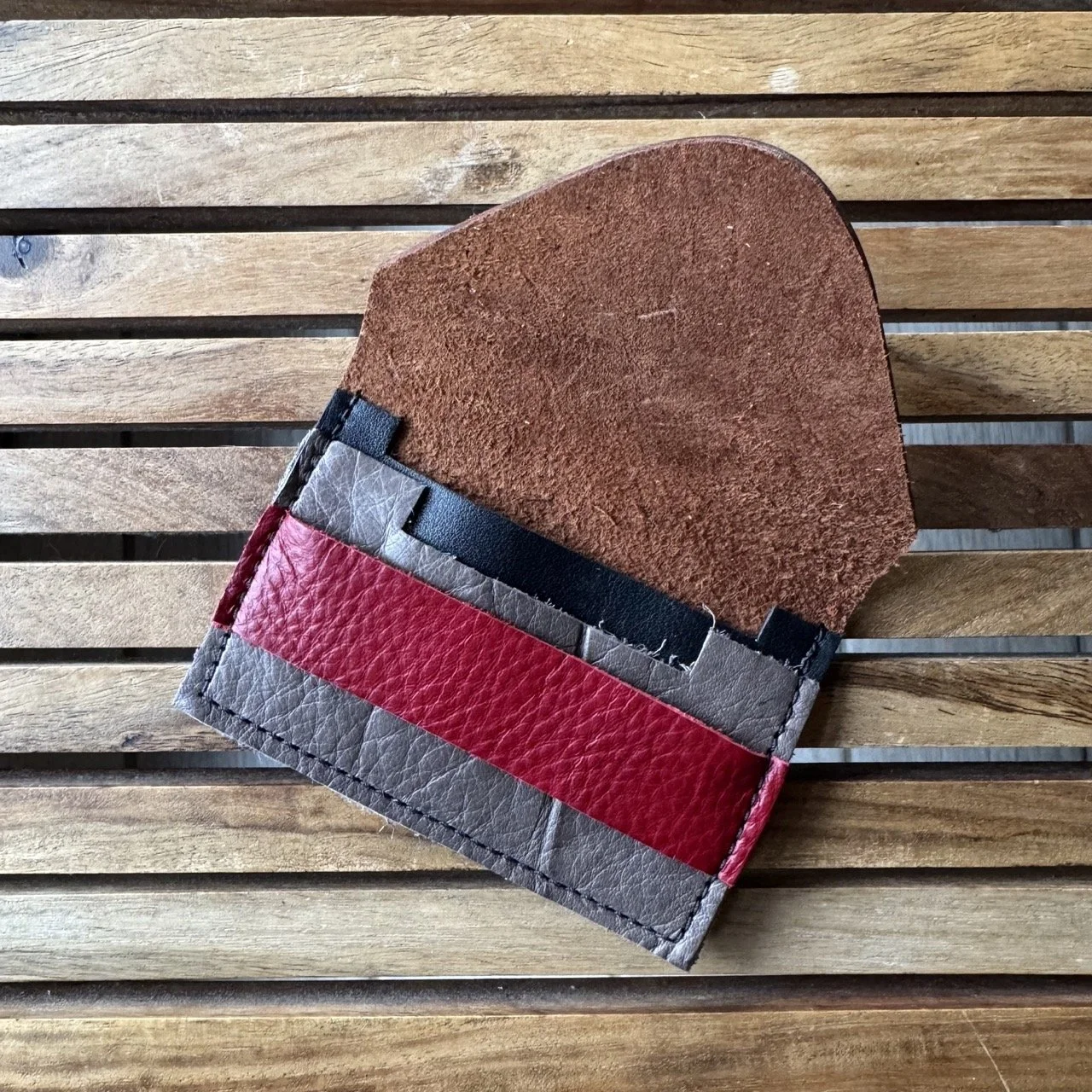 This is a minimal slim wallet, handmade using leather scraps (some unique swatches, some in-stock, some old stock) so almost every wallet is one of a kind. The leather pockets will form to what you put in it. Some only carry 5 cards, some carry 20. Save some room to fold your cash to fit it in. The strap keeps the flap down and your items secure. Fits perfectly in a front or back pant pocket.