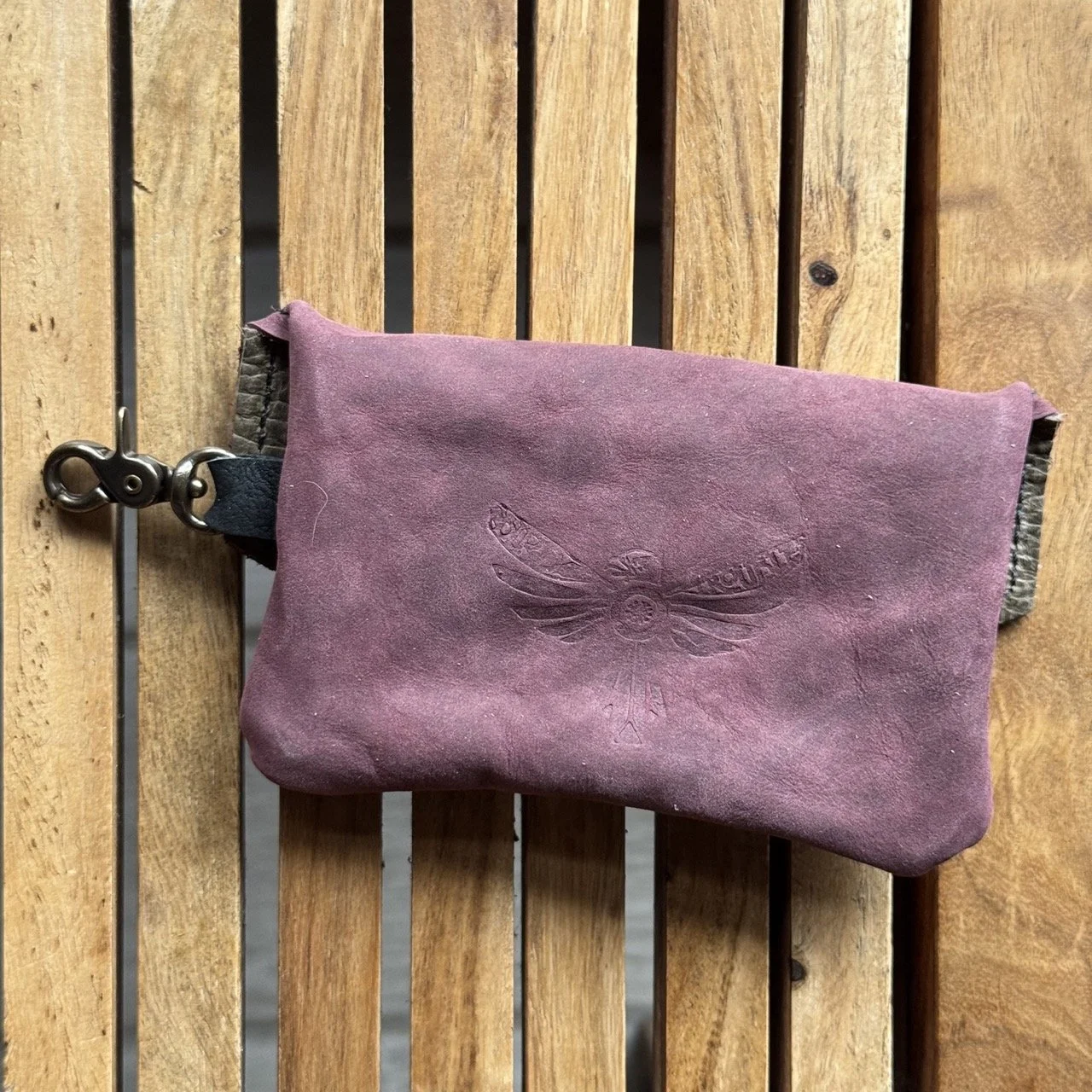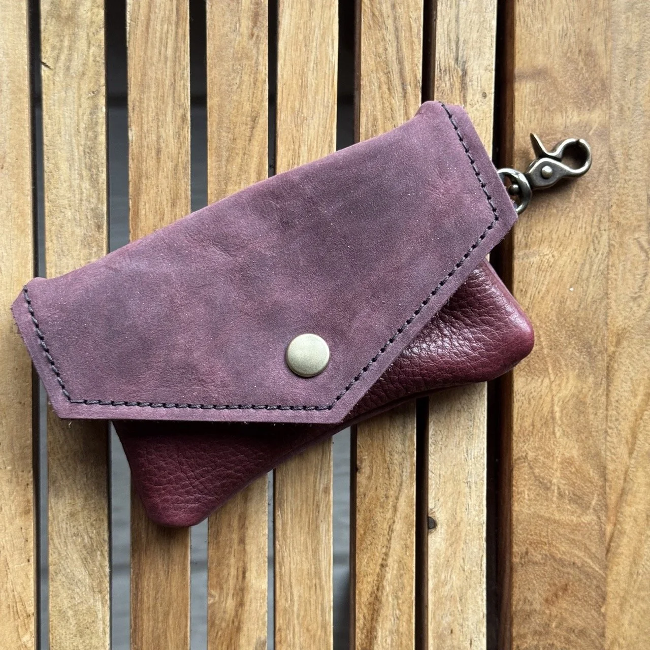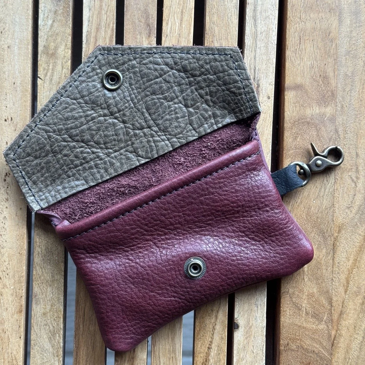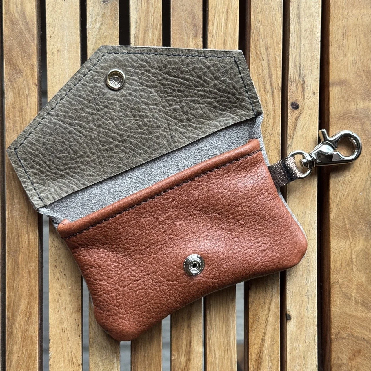 One of a kind leather snap pouch to use as a wallet or card holder. Snap closure keeps your coins, cards, etc inside. Use the small trigger clip to hook your snap pouch onto your bag hardware or keys.