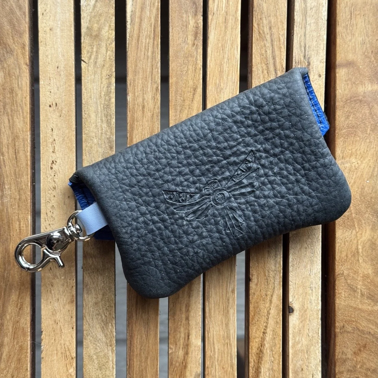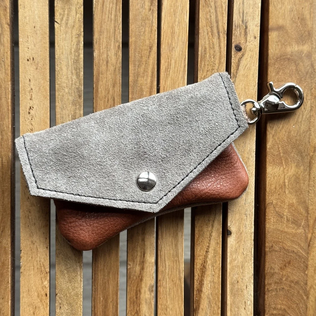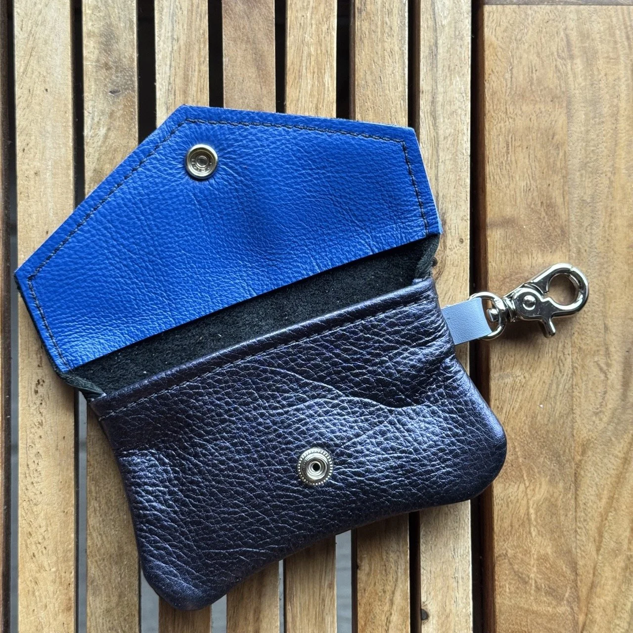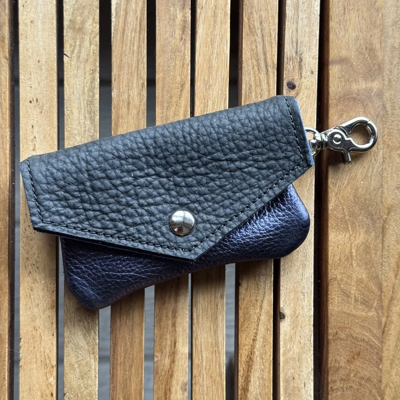 One of a kind leather snap pouch to use as a wallet or card holder. Snap closure keeps your coins, cards, etc inside. Use the small trigger clip to hook your snap pouch onto your bag hardware or keys.