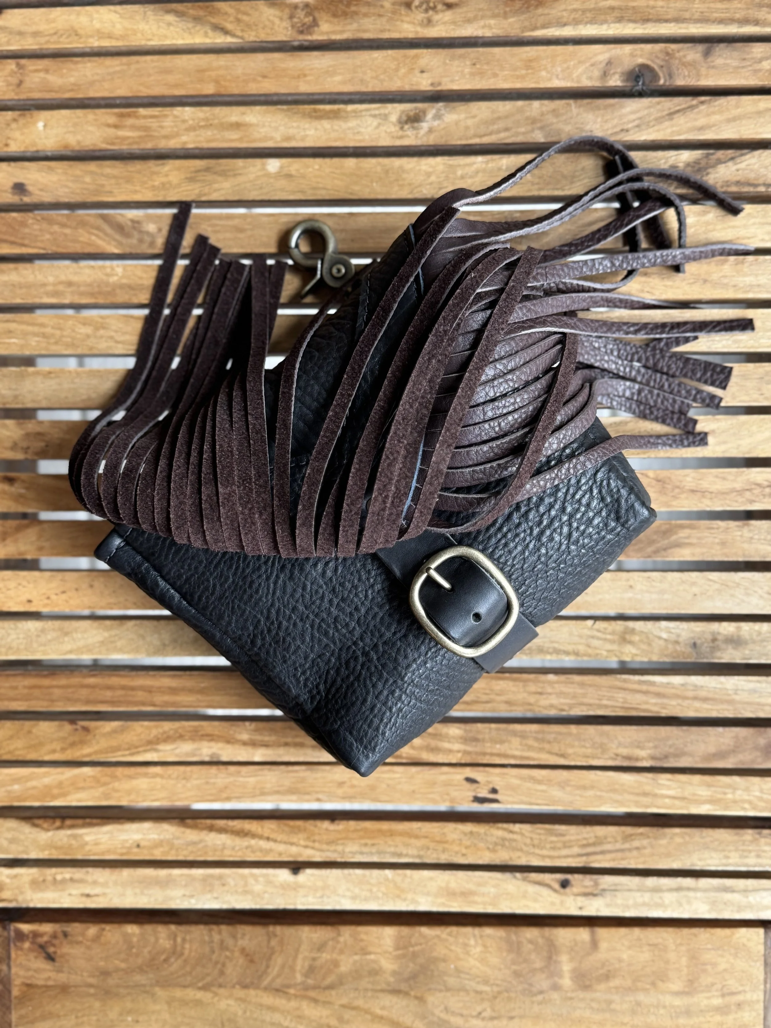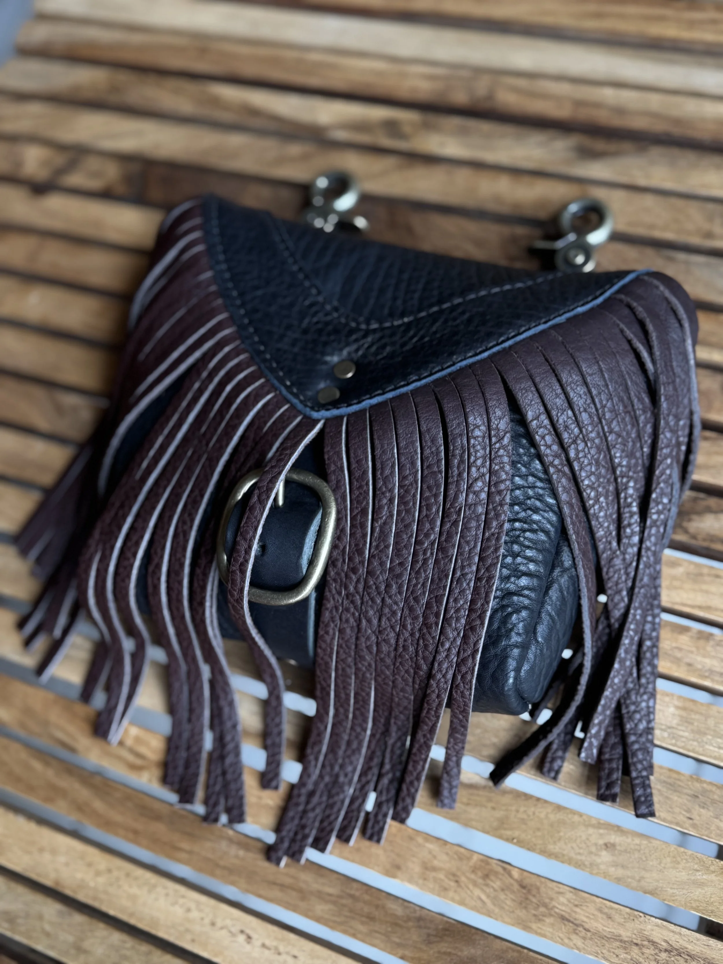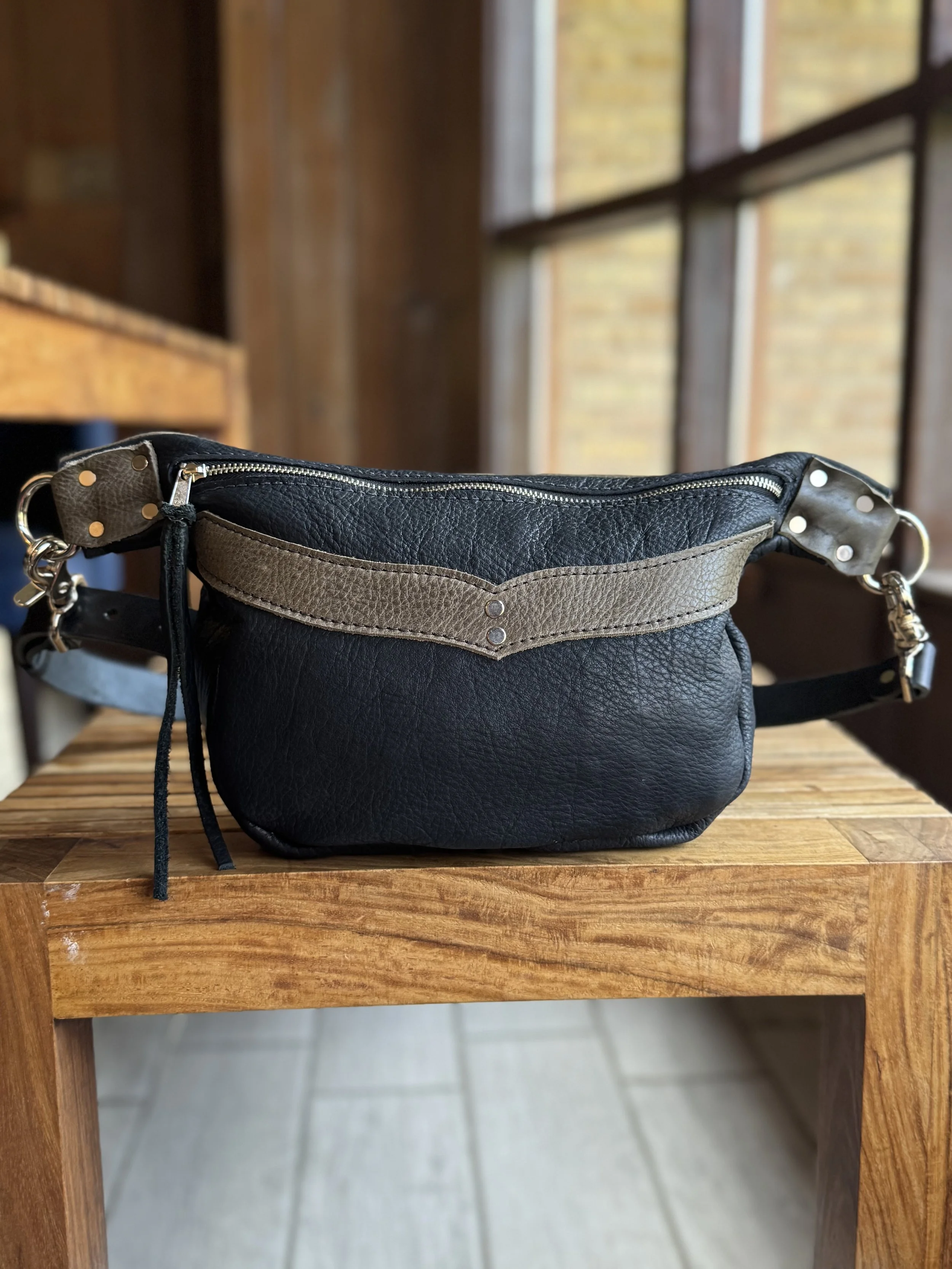 Materials: 3oz black bison leather and antique brass or nickel hardware
